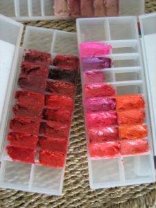 Сейчас минералы растворяют, зачастую, с помощью касторового и других масел. Предварительно минералы измельчаются в специальном шейкере до такого состояния, что почувствовать на губах что-то твердое или получить неровный цвет практически невозможно. А масло помогает не только растворять, но и превращать минералы в однородную массу.