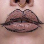 Шаг 2. Хайлайтером выделить галочку над верхней губой. Нанести контур фиолетовым карандашом. Он не должен быть светлее помады. Контур тоже надо наносить, начиная с галочки. Уголки губ стоит прокрашивать в улыбке, чтобы кожа была более натянутой.