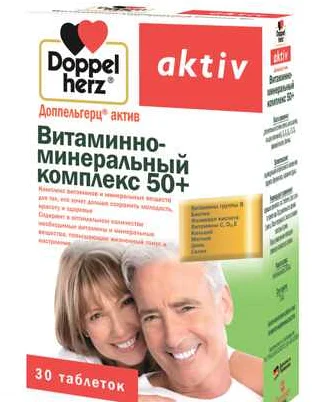 “Доппельгерц Актив 50+”. Помогает организму переживать стрессы, переутомления. Поможет восполнить недостатко элементов при неправильном, нерациональном питании, при атеросклерозе. Средство повышает настроение, тонус, выносливость, продлевает молодость. Благодаря особому составу снижает риск развития остеопороза, болезней сосудов и сердца, возникновения бляшек на стенках сосудов, регулирует концентарцию сахара в крови, поддерживает работу нервной системы.