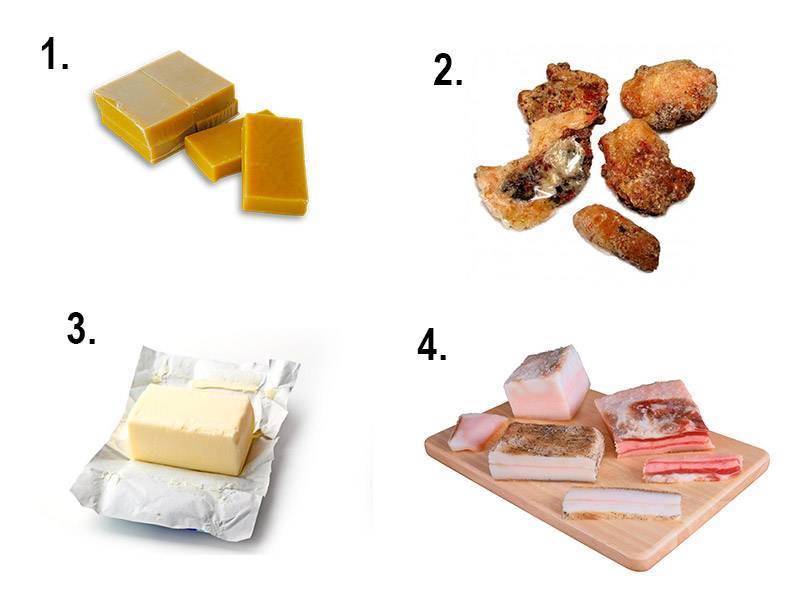 1. Пчелиный воск, 2. Живица еловая, 3. Сало, 4. Сливочное масло