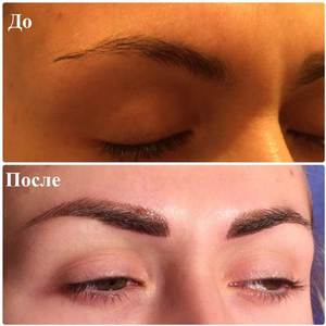 Данная процедура эффективна и в особо сложных ситуациях, когда сильно повреждены, не правильно растут или редкие, ослабленные и местами отсутствуют волосинки. Во время процедуры не происходит нарушения роста бровей и она не наносит вреда поверхностному слою кожи. Средство имитирует растущие волоски и наносится последовательно на проблемные места.