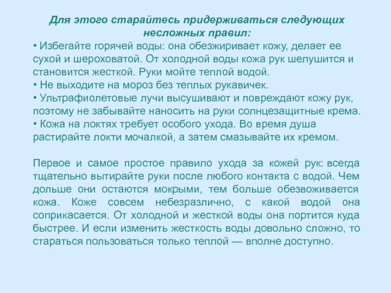 Первое и самое простое правило ухода за кожей рук: всегда тщательно вытирайте руки после любого контакта с водой. Чем дольше они остаются мокрыми, тем больше обезвоживается кожа. Коже совсем небезразлично, с какой водой она соприкасается. От холодной и жесткой воды она портится куда быстрее. И если изменить жесткость воды довольно сложно, то стараться пользоваться только теплой — вполне доступно.