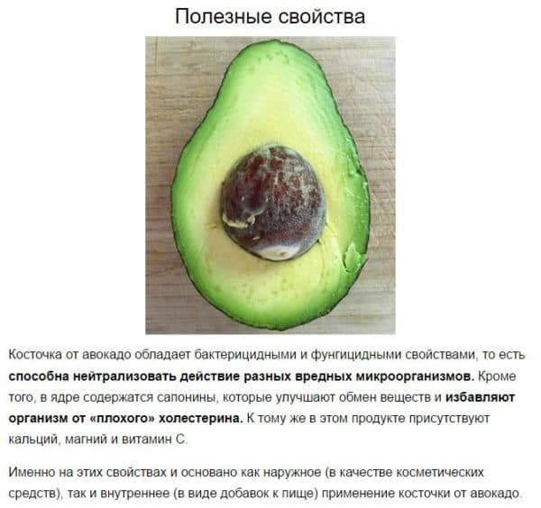 В косточке и кожуре авокадо содержится персин – фунгицидный токсин. Он вызывает аллергию, приводит к проблемам с пищеварением. Высушенная и измельченная косточка применяется в народной медицине для лечения разных заболеваний. Кроме токсинов, в ней есть и целебные вещества.