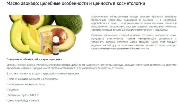 В своем составе авокадо содержит огромное количество необходимых организму витаминов, микроэлементов и различных полезных веществ. Масло этого плода: