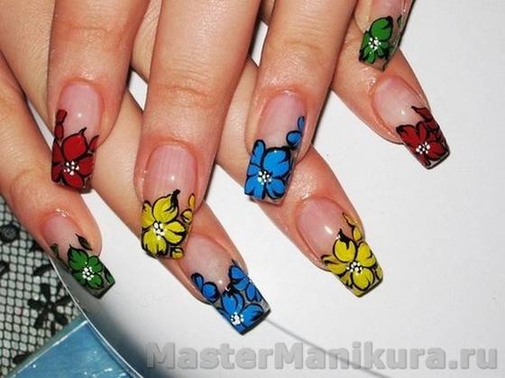 Рисовать цветы можно разными техниками. Проще всего создать шаблон лепестков гель-краской или акрилом и заполнить его цветом.