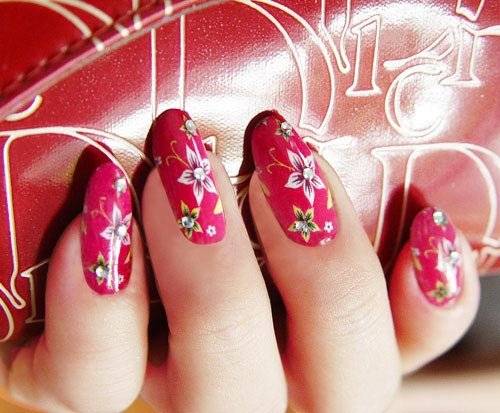 Из того, чем рисуют рисунки на ногтях, выделяют лаки, акриловые краски, изделия для декора, наклейки, стразы, фольгу, клей, акварель.