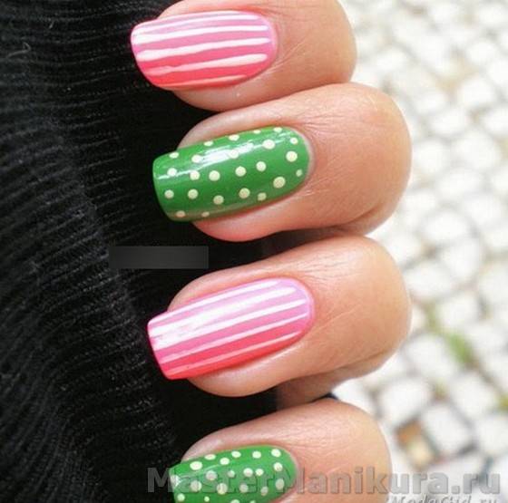 - при помощи губки делается градиентный маникюр. Для рисунка необходимы 2 и больше цветных лака. Прекрасно смотрится на любой длине ногтей;