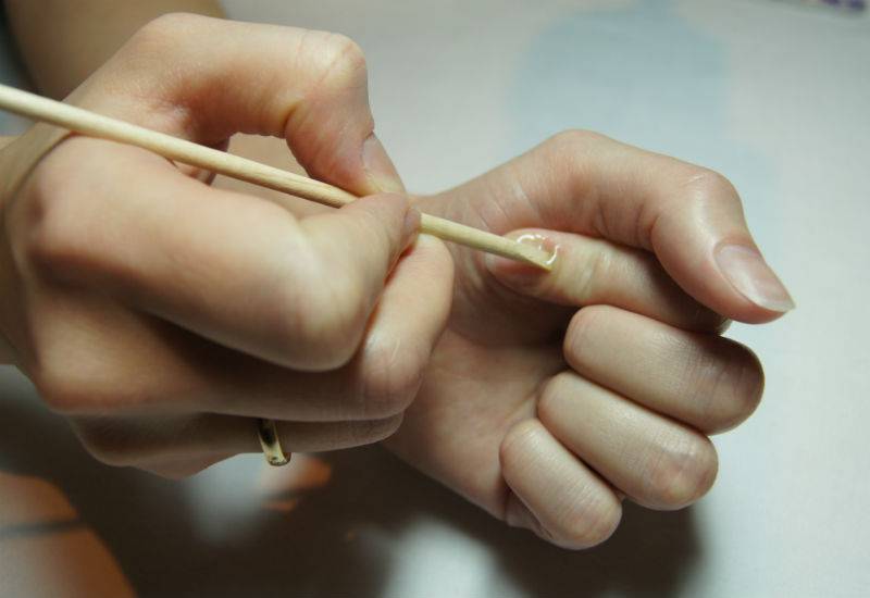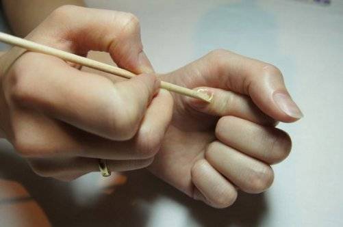 - Борьба с кутикулой. Если вы сторонник европейского маникюра, то без такого аксессуара не обойтись. При такой технике кутикула не обрезается, а просто отодвигается и вот здесь на помощь вам придет деревянная палочка. Для этой процедуры используется тупой конец. При пользовании этим инструментом можно забыть о пораненной кутикуле и заусенцах.