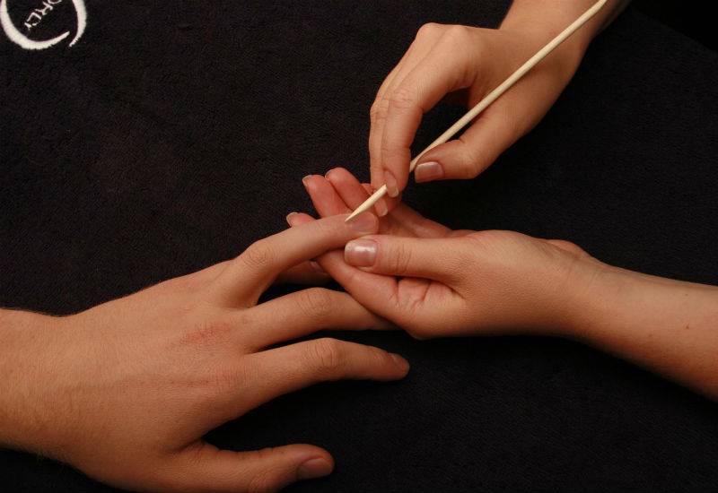 После того как кутикула будет размягчена специальным средством, заостренным концом апельсиновой палочки аккуратно поддевают ороговевшие клетки кутикулы и они легко отделяются от основного слоя кутикулы.Важно, чтобы кутикула была хорошо размягченной, тогда удаление лишних клеток апельсиновой палочкой пройдет без особого труда