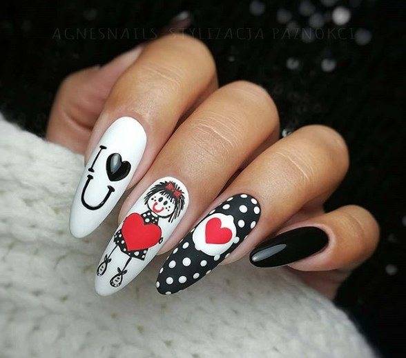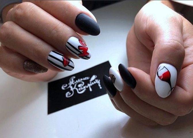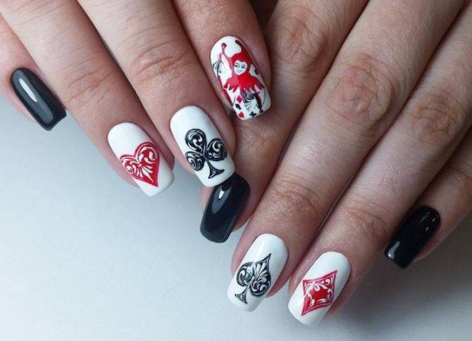 https://www.instagram.com/best_manicure.ideas/ Один из популярных вариантов украшения маникюра — карточная тематика, которая как раз сочетается с красно-черно-белой цветовой гаммой. Ноготки можно украсить изображение игральных карт и разных мастей.