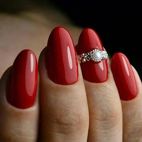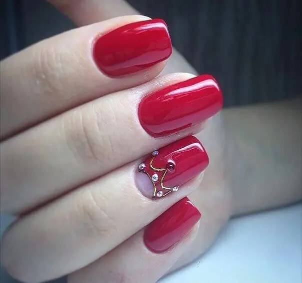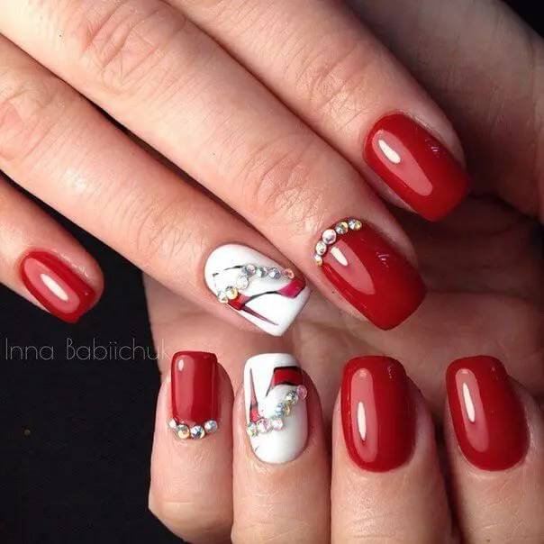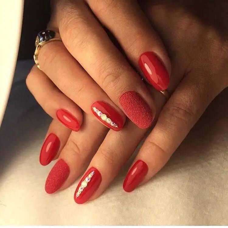 – хорошо смотрится модный красный маникюр, дополненный линиями, выложенными мелкими стразами. Лучше всего делать такие акценты только на одном или двух ногтях, но ни в коем случае не на всех.