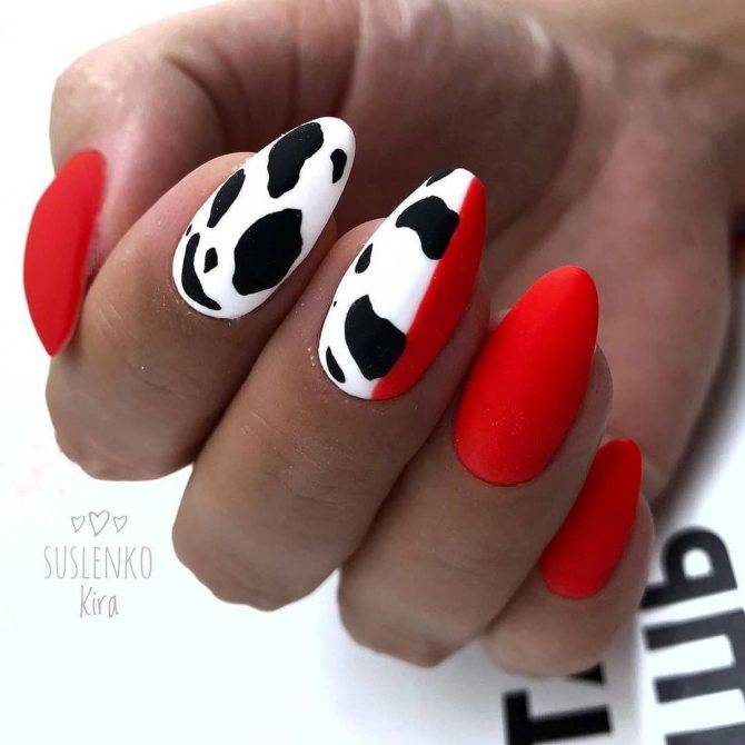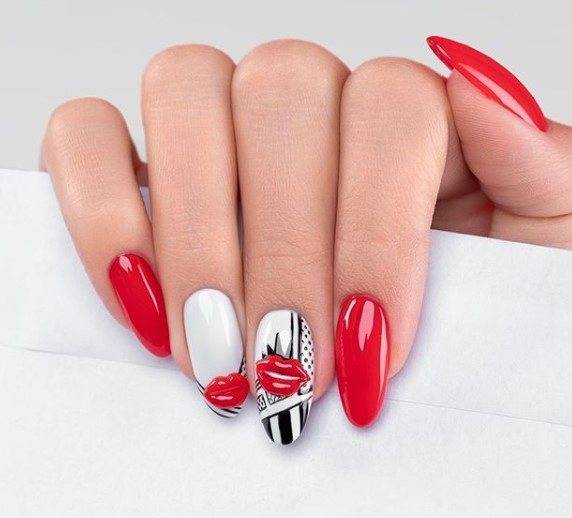 Добавить свежести и оригинальности любому маникюру в красных, черных и белых тонах можно с помощью принтов и рисунков:
