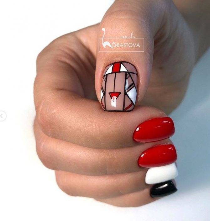 Несмотря на присутствие нескольких цветов, такой маникюр смотрится довольно сдержанно, потому что белый, черный, серый не перебивают красный, а служат ему фоном.