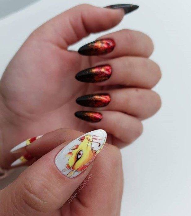 Еще один яркий и эффектный вариант такого маникюра — с добавлением золотистых акцентов. Это может быть покрытие золотого цвета, полосочки или орнаменты, золотистое напыление либо лак с эффектом шиммеринга. Изучите нашу фотоподборками с примерами такого нейл-дизайна, чтобы вдохновиться и поэкспериментировать с ярким маникюром.