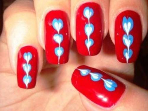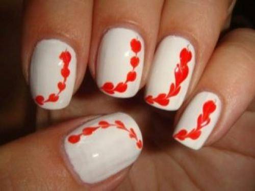 - Зубочистку мокните в красный лак и нарисуйте на ногте несколько точек, штук пять, которые как бы идут одна за одной