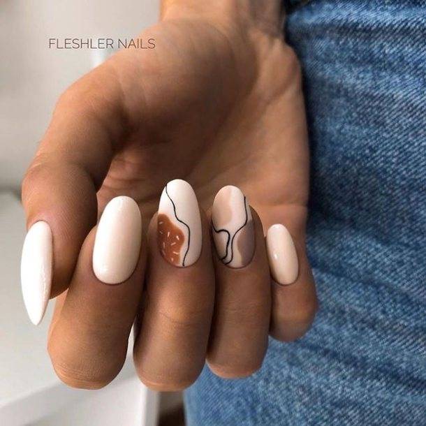Отличным выбором будет маникюр на светлой камуфлирующей базе с растительной абстракцией и точками в бежевых и черно-белых цветах. Также прекрасно будут смотреться ногти в нюдовом оттенке с нежными желто-голубыми абстракциями на двух ноготках.