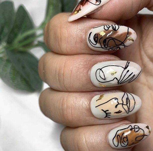 Если ваш мастер маникюра или вы сами умеете виртуозно владеть кистью, то можно нарисовать абстрактные лица на ногтях в стиле Пикассо. Этот вариант Абстрактного дизайна маникюра сейчас очень популярен.