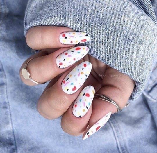 Дизайн маникюра «Перепелиное яйцо» или как его еще называют «Брызги краской», сам по себе уже выглядит как Абстрактная картина. Таким дизайном можно украсить все ноготки или сделать акцент на двух-трех ногтях.