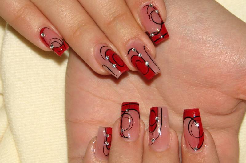 Есть и другой вариант. Мысленно проведите вертикальную линию, которая поделит ногтевую пластину пополам. Каждую половинку следует закрасить определенным цветом лака, а два пальца (например, безымянный и средний) покрасить разными цветами (например, черным и красным). На черной половине проставляются красные точки, а на красной – черные. С помощью иголки проводятся горизонтальные линии от середки точки к центру ногтевой пластины. При этом линию следует слегка занижать. Так нужно пройти все точки.