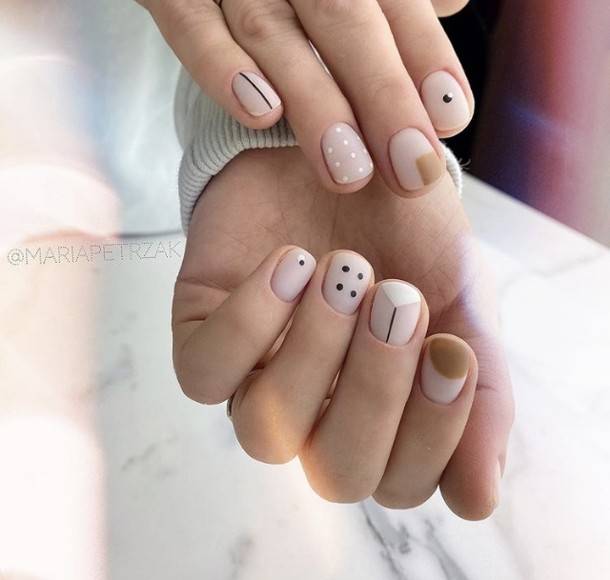 Если вы любите легкий лаконичный маникюр без излишеств, то Абстрактный маникюр в стиле «Минимализм» – это, то что вам нужно. Например, можно нанести светлую базу на все ногти, и на одном или двух ноготках сделать аккуратные тонкие геометрические рисунки или абстрактные лица.