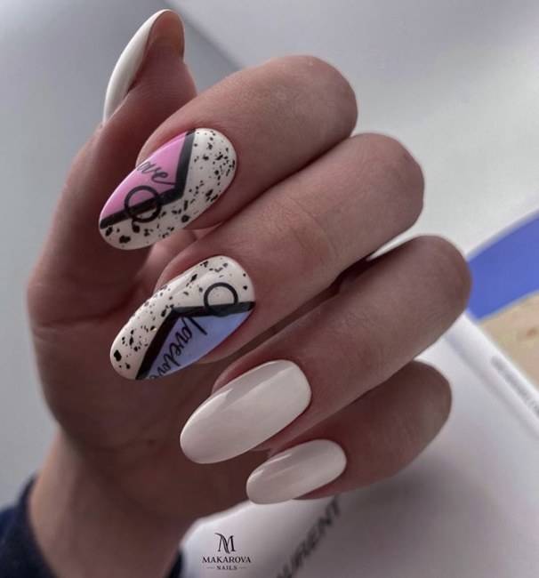 Абстрактный дизайн в маникюре тоже создается мастерами из сочетания цветов и различных геометрических элементов: пятен, точек, мазков, линий, завитков, абстрактных лиц и фигур. Такой дизайн подойдет под любой образ. Его можно делать ярким или нежным, на длинные или на короткие ногти, подобрать под наряд или сделать в трендовых цветах сезона.