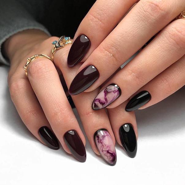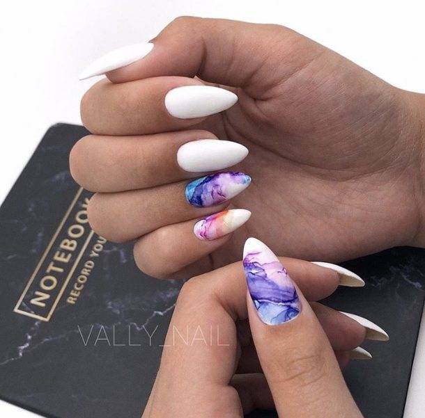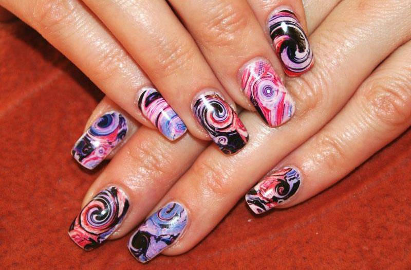 Водный маникюр «Абстрактные переливы». Освоив интересную технику водного маникюра, можно создать оригинальный дизайн, который представляет собой игру разных цветов, перетекание оттенков друг в друга.