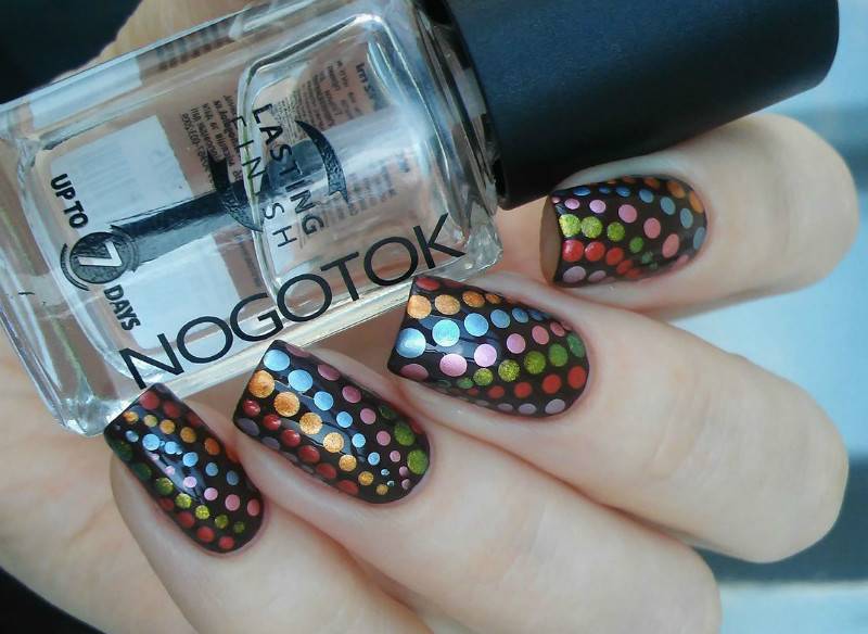 - Кофейным лаком нанесите несколько достаточно больших пятнышек по всему ногтю