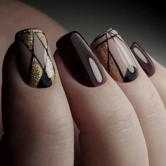 Шоколадная геометрия на коротком маникюре выглядит роскошно: просто бархатные пальчики.