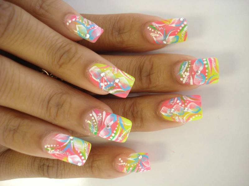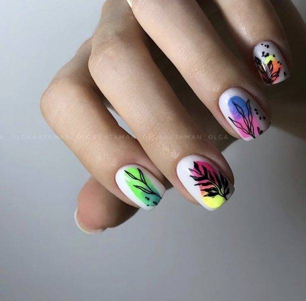 - Лето. Теплое время года как нельзя лучше подходит для создания маникюра с использованием ярких цветов и необычного дизайна. Эффектная волна, разноцветная радуга, паутинка и омбре – все это идеально будет сочетаться с абстрактной тематикой всего нейл-арта.