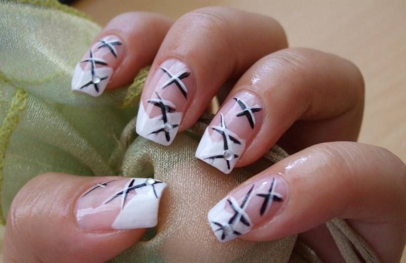 Оригинальным видом дизайна ногтей может стать французский маникюр, если его выполнить в абстрактном стиле. Например, безумно стильно получается, если в классическом варианте исполнения френча кончики ногтей оформить в стиле абстрактной геометрии в черно-белом цвете. Абстрактный френч с черными кончиками ногтей чем-то напоминает готический стиль.