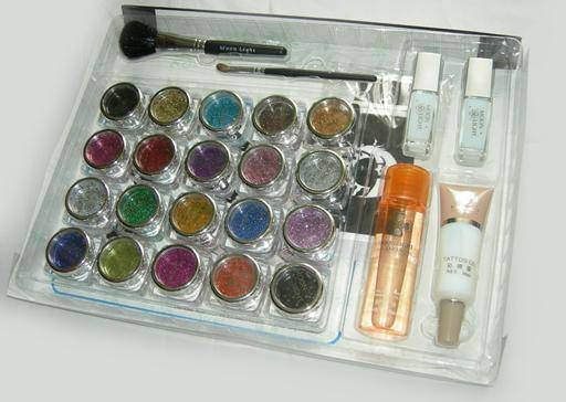 - Понадобятся такие материалы: клей для тела, трафарет, кисти разной толщины, блестки или стразы, спонжи и спирт.