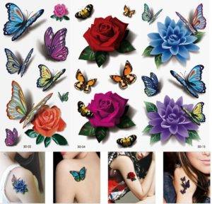 | Преимущества | Нетоксичная краска, похоже на настоящее тату, яркость | Гипоаллергенный клей, красиво смотрится на солнце, яркие, безопасные рисунки, не оставляют следов | Совмещает способ перевода рисунка и аэрографию краской (на резиновый штамп наносят специальную густую краску, печатают на коже, закрепляют краской) |