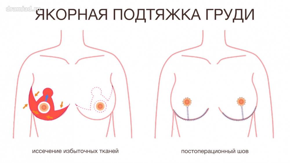 Основное показание к якорной подтяжке — ярко выраженное обвисание груди или сильный птоз, когда сосок и ареола опустились на 2-3 см ниже подгрудной складки. Грудь выглядит обвисшей и дряблой. Такое может произойти по нескольким причинам: