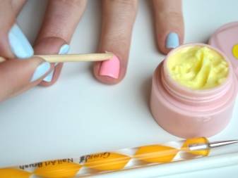 Этот шарик размещают на ноготь и ждут до тех пор, пока он подсохнет. Затем можно приступать к лепке, применяя вспомогательные материалы в виде зубочистки и кисти.