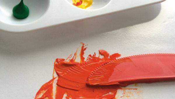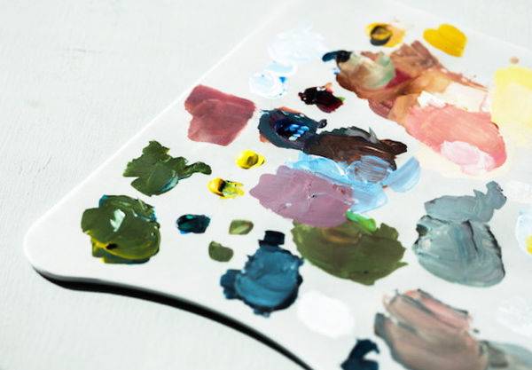 Палитра для акриловых красок продается в художественных магазинах. Чаще всего она представляет собой белую пластиковую дощечку с отверстием для пальцев. Такая палитра хорошо отмывается от краски, которая не успела засохнуть. Иногда палитры изготавливают из оргстекла: они ничем не уступают пластиковым, но по весу тяжелее. Палитру можно сделать и самостоятельно из подручных материалов (даже из одноразовой пластиковой тарелки).