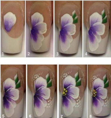 Рисунки на ногтях акриловыми красками наносят пошагово, начиная с основы