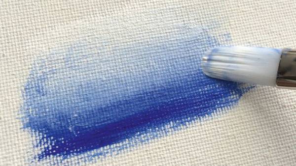 Градиенты — сложная техника для мастера акриловой живописи. Сначала начните с белого, а затем с помощью кисти добавьте синий вдоль нижней части области смешивания. Двигаясь вперёд и назад, быстро ведите вверх и вниз по области, пока не получите хороший градиент от более тёмного синего до белого.