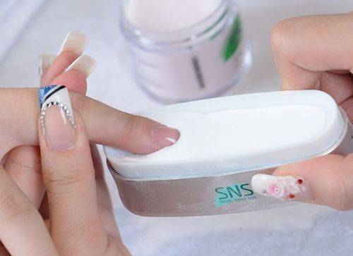 Во втором пудру перемешивают с бесцветным раствором, которым необходимо орудовать быстро, так как он оперативно застывает от контакта с воздухом. Поэтому чаще всего такое решение используется, когда необходимо удлинить ноготь.