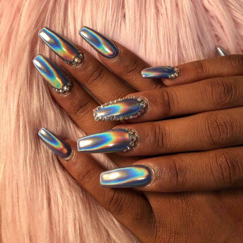- Его делают с помощью серебряных блёсток, которые накладываются на отдельные ногти.