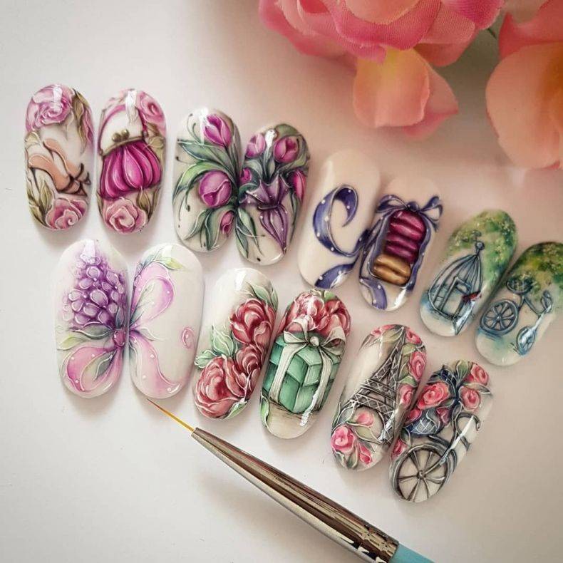 - Акриловыми красками можно создавать узоры и на ногтях, покрытых гель-лаком. В данном случае следует снять липкий слой, однако краску не нужно разводить водой, т. к. финишное покрытие не полимеризуется.