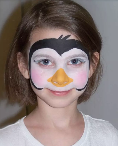 Пингвин – тоже очень красивый аквагрим. Чтобы сделать его, вам понадобится 4 цвета. Черный, белый, желтый и розовый.