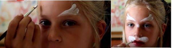 Важно: рисунок всегда выполняется сверху вниз (лоб, глаза, нос, щеки, подбородок). Кисточку и спонж необходимо держать прямо, не давая возможности краскам растекаться по лицу