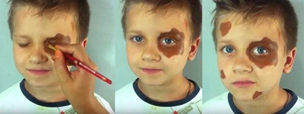 - Начнем с пятна. Цвет – коричневый (любой, свойственный собакам). Ребенок должен закрыть глаза. На одном из глаз (левом, в данном случае) рисуется «клякса». Заполняется все пространство внутри контура, до линии роста ресниц. Границы не ровные, кривые. Верхний край захватывает линию роста брови. Хаотично расположите на «мордочке собаки» еще 3-4 пятнышка. Не переусердствуйте, избегайте наляпистости.