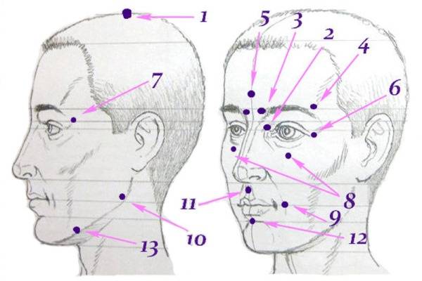 - Перейти к другой паре точек, расположенных на самой выступающей части скуловой дуги. Необходимо насадить пальцы на косточку.