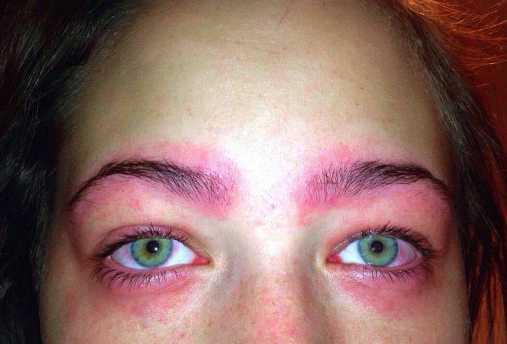 - в области бровей проявляется локальное покраснение, сыпь, сопровождающаяся зудом;