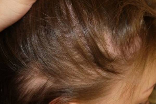 На фото можно увидеть небольшие очаги облысения круглой формы, которые по периферии имеют волосы, легко удаляемые. Локализация пятен происходит в теменной и затылочной части головы.
