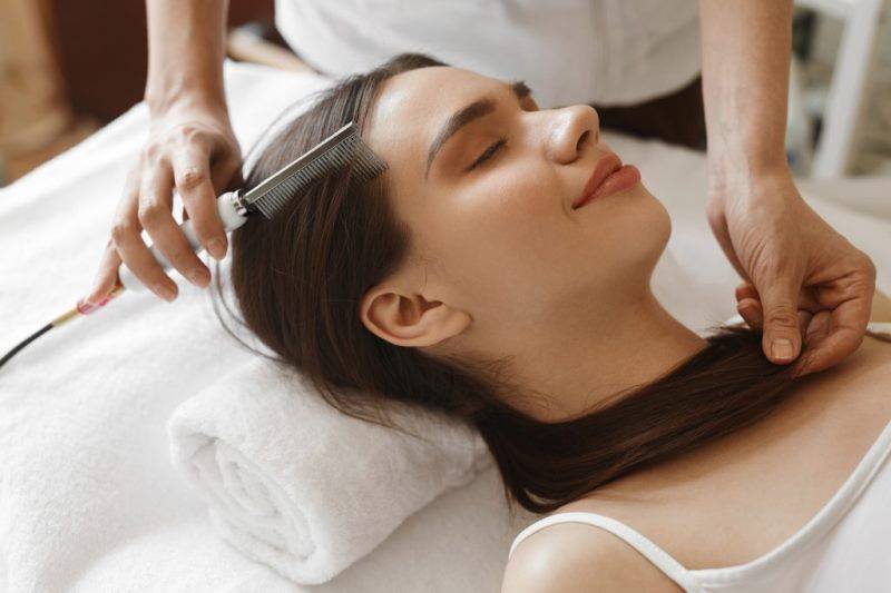 - Электростимуляция. Процедура укрепляет весь организм, положительно влияет на рост волос. Для достижения желаемого результата обычно проводят 10-12 сеансов.