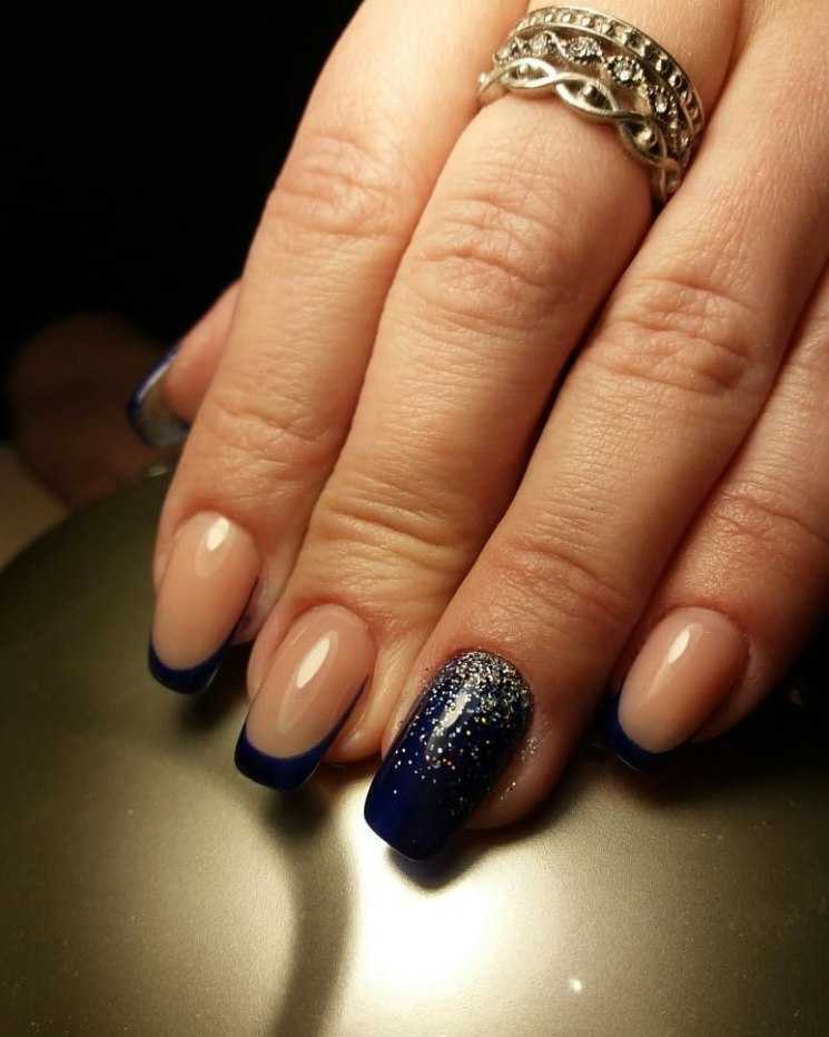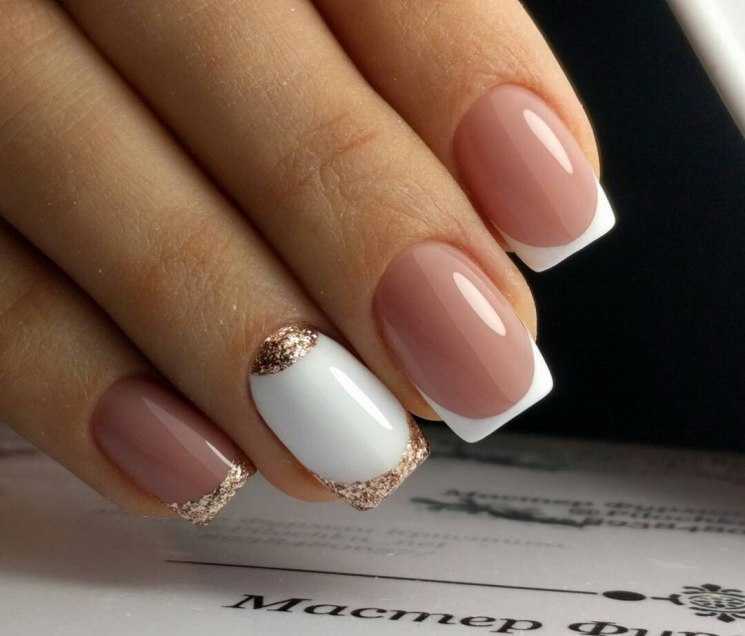 Существует множество интересных идей френча для коротких ногтей. С помощью блестящего дизайна можно добавить немного дополнительного мерцания в жизнь. Френч включает нейтральный фон, темные кончики и блеск, который распределяется неравномерно.