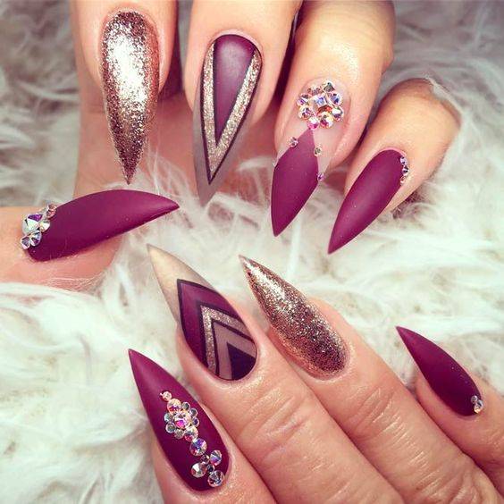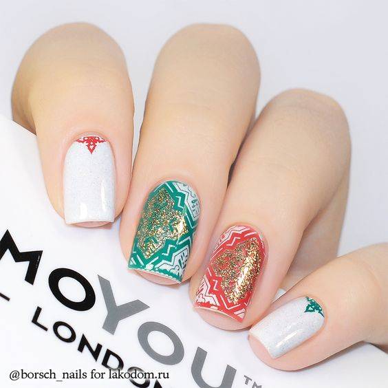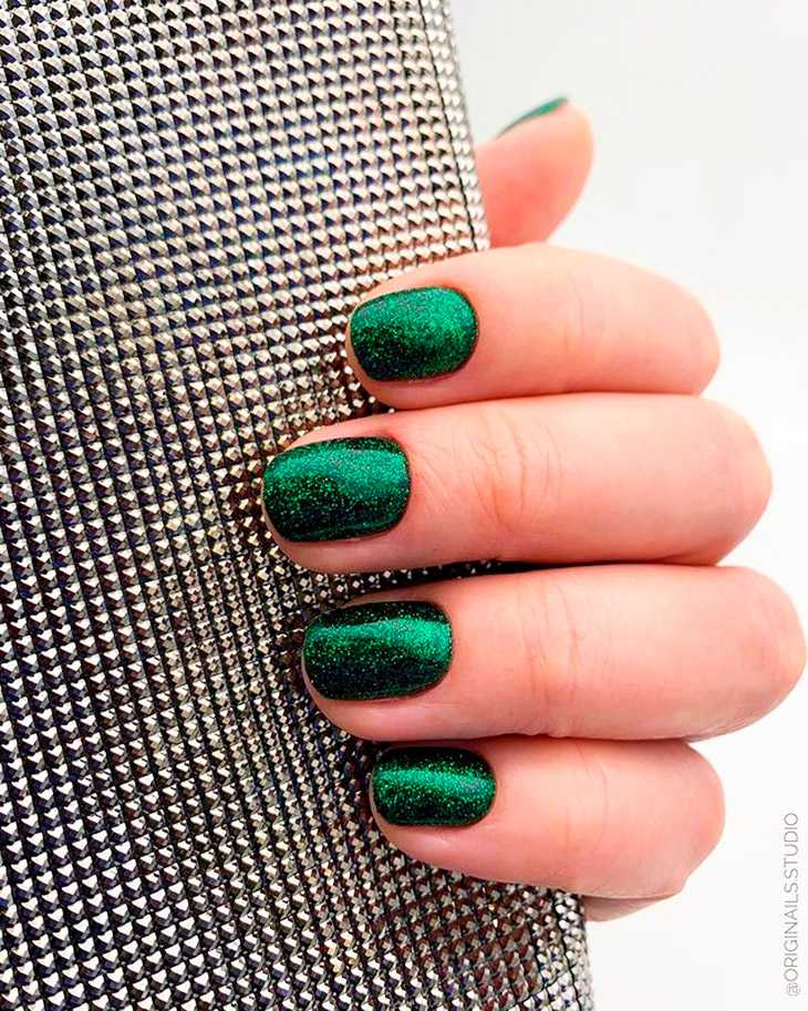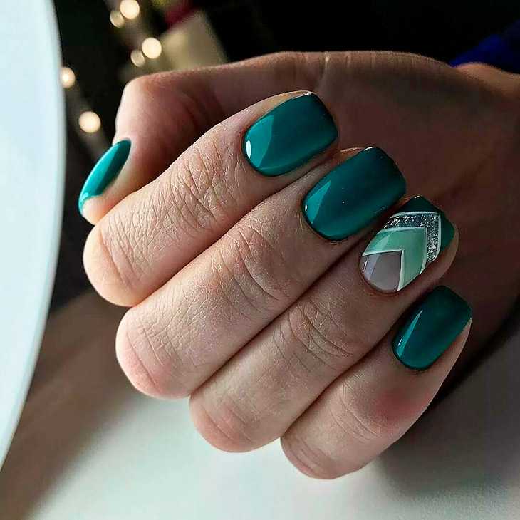 Насыщенный цвет не терпящий излишек. Самая актуальная классическая комбинация – это чёрно-зелёный или золото. В оформление маникюра лучше остановиться на френче, кошачьем глазе или небольшом количестве страз.