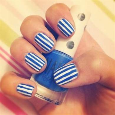 - Полосатый дизайн ногтей. Выбирая этот способ американского маникюра следует использовать лаки двух или более цветов. После нанесения лака-основы ноготь покрывается лаком светлого тона, а затем рисуются полосы более темным лаком. Направление полосок может быть как вертикальным, так и горизонтальным или диагональным. После создания рисунка наносится топовое покрытие.